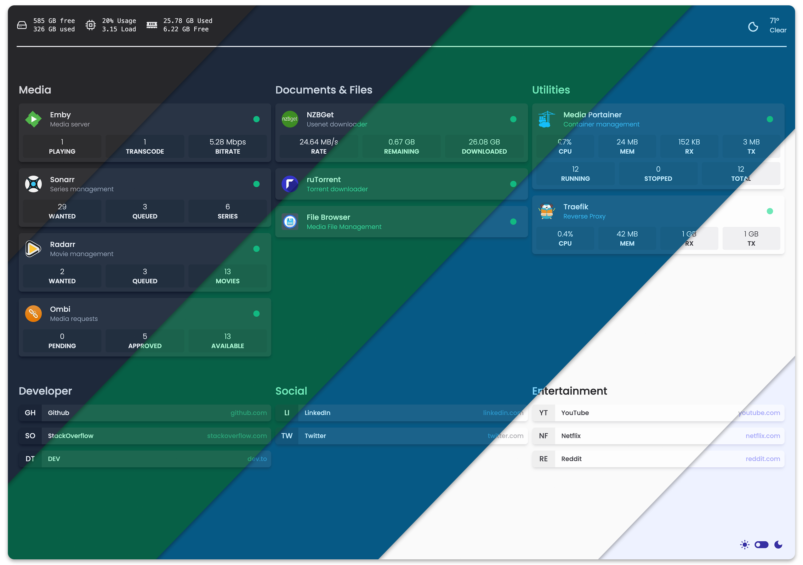 - Ombi, Overseerr, Jellyseerr, Jackett, NZBGet, SABnzbd, ruTorrent, Transmission